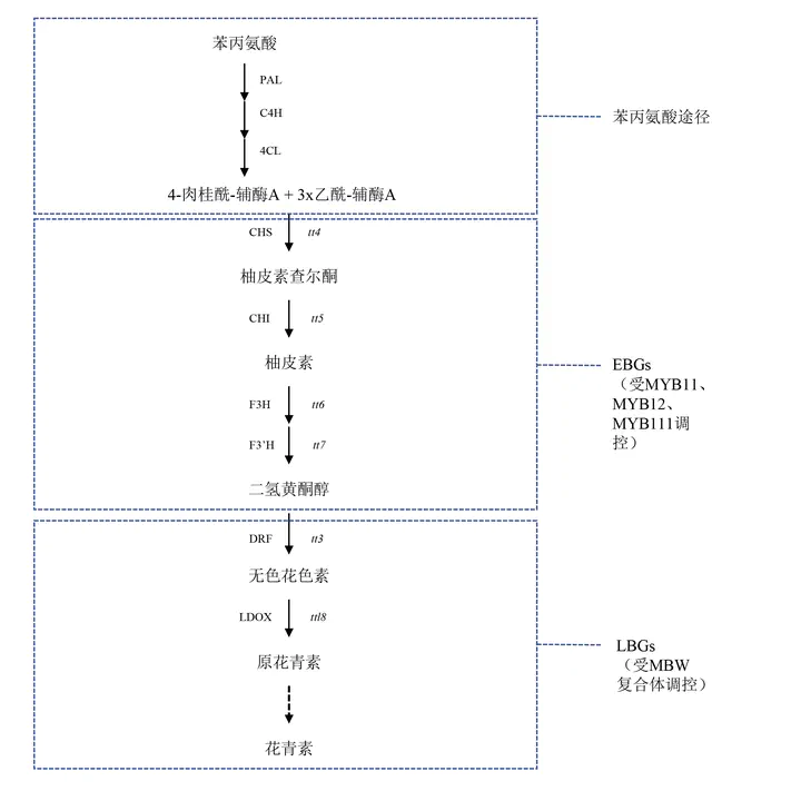 The biosynthetic pathway for flavanols, anthocyanins, and PAs in Arabidopsis